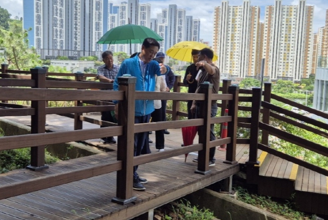 ![]() 강문성 기획행정위원장이 문수동 무장애나눔길 현장을 둘러보고 있다. |