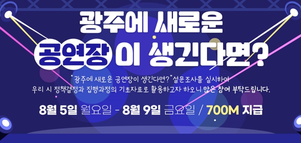 ‘광주에 새로운 공연장에 대한 당신의 의견은?’이라는 주제로 실시하는 설문조사는 광주에 새로운 공연장이 필요하다고 생각하는지, 새로운 공연장이 생긴다면 어떤 장르를 선호하는지, 공연장 건립 찬반 의견은 어떤지 등을 듣는다.