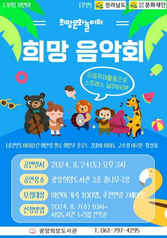 ‘희망문화놀이터’는 매월 어린 자녀를 둔 가족에게 문화 예술공연을 제공하고 있는 광양희망도서관의 특화 프로그램으로, 이달 열리는 공연은 여름을 맞아 더 많은 가족이 참여할 수 있도록 토요일에 개최한다.