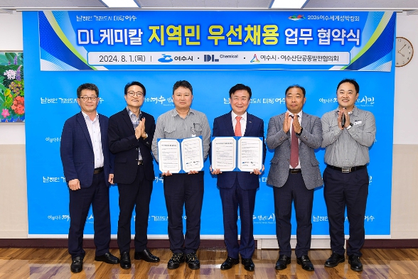 지난 1일 오후 시장실에서 열린 협약식에서 DL케미칼은 산단 내 지역 청년 취업률 제고를 위해 합리적인 여수시 청년 우대제도를 마련하고 신규 인력 채용 시 적극 반영하기로 했다.