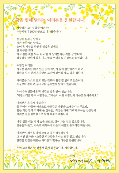 이 교육감은 서한문에서 “자랑스러운 광주 수험생들, 그대들이 어떤 사람인지 마음껏 보여주라”며 “여러분들 곁에는 부모님, 친구들, 선생님들, 광주교육가족 모두가 한마음으로 함께하고 있으니 수능시험이 끝나는 순간까지 최선을 다해 주기 바란다”고 밝혔다.