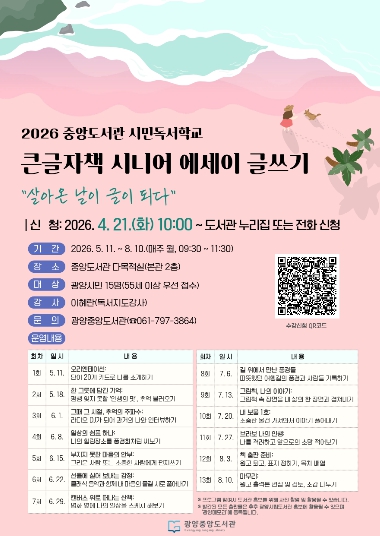 ![]() 광양중앙도서관 큰글자책 시니어 에세이 글쓰기 참여자 모집 도서관과(홍보문) |