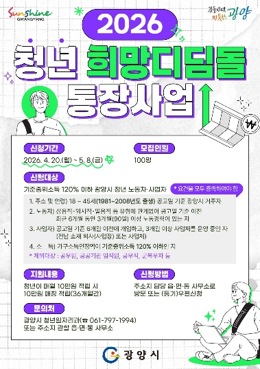 ![]() 광양시, 2026년 ‘청년 희망디딤돌 통장사업’ 참여자 모집(홍보문) |