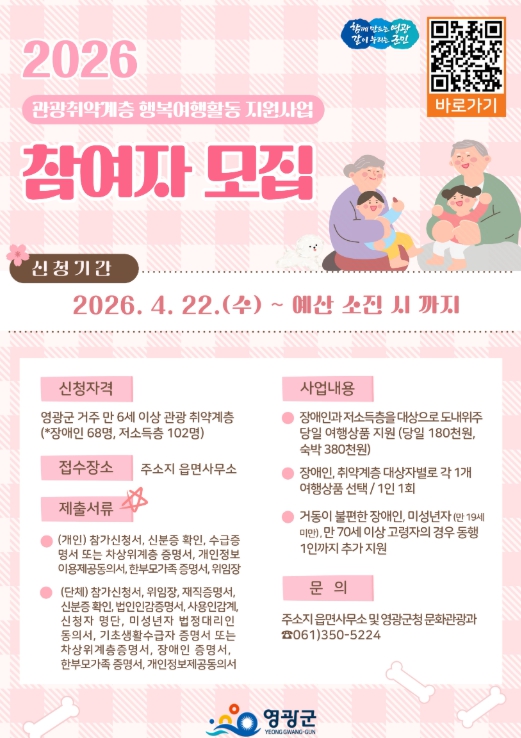 ![]() 2026년 영광군 관광취약계층 행복여행활동 지원사업 참가자 모집 |