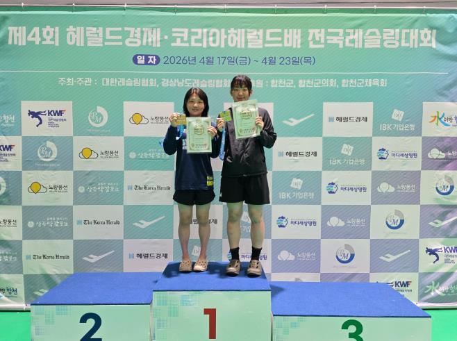 ![]() 이나현 선수(왼쪽)와 오채은 선수(오른쪽)가 ‘제4회 헤럴드경제·코리아헤럴드배 전국레슬링대회’에서 우수한 성적을 거두고 기념촬영을 하고 있다 |