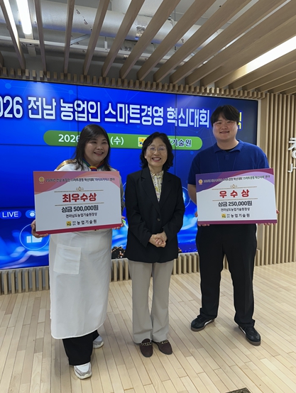 ![]() 지난 22일 수경당 이채율 대표와 동호랑 이동호 대표가 ‘전남 농업인 스마트 경영 혁신대회’에서 수상했다. |