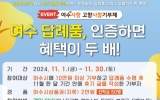 [뉴스앤저널]여수시는 오는 30일까지 고향사랑기부제 참여 이벤트 ‘여수 답례품, 인증하면 혜택이 두 배!’를 진행한다. 이번 행사는 여수시에 10만 원 이상 기부하고 답례품을 수령한 후 후기 글을 작성하면 선착순 50명에게 여수시상품권(지류) 2만 원을 지급하는 이벤트다. 참여 방법은 개인 SNS(인스타그램, 페이스북, 트위터, 블로그, 유튜브 등)나 네이버카페 등 온라인 커뮤니티에 답례품 후기와 사진을 게시 한 후 URL·링크(인터넷주소)를 전자우편 또는 카카오채널 ‘여수사랑 고향사랑기부제’ 1:1 대화방에 제출하면 된다. ...