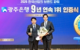 전라남도 민슬기 기자2026. 04.16[뉴스앤저널]광주은행은 16일, 한국능률협회컨설팅(KMAC)이 주관하는‘2026 한국산업의 브랜드파워(K-BPI)’지방은행 부문 9년 연속 1위 선정에 따른 인증식을 개최했다고 밝혔다. 이날 인증식은 광주은행 본점에서 열렸으며, 정일선 광주은행장과 송광호 한국능률협회컨설팅 그룹장을 비롯한 임직원 및 관계자들이 참석해 브랜드 경쟁력 확보 성과를 공유하고, 지속적인 성장 의지를 다지는 시간을 가졌다. ‘한국산업의 브랜드파워(K-BPI)’는 국내 주요 산업을 대상으로 소비자 조사를 실시해 브랜드 인지도와 충성도 등을 종합적으로 평...