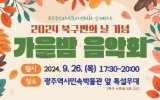 신안 온라인뉴스팀2024. 09.24[뉴스앤저널]광주시 북구가 다가오는 구민의 날을 기념하고 주민 화합을 도모하기 위해 오는 26일 ‘북구민의 날 기념행사’를 연다고 24일 밝혔다. 구민의 날은 ‘북구민의 날에 관한 조례’에 따라 북구 설치령 공포일인 ‘9월 26일’을 기념하고자 지난 2020년에 지정된 날로 북구는 매년 이날 지역주민의 대통합과 애향심 고취를 위해 기념행사를 이어오고 있다. 광주역사민속박물관 광장 일원에서 개최되는 이번 기념행사는 지역주민 1천여 명이 참석한 가운데 ‘식전 공연’을 비롯해 ‘기념식’과 ‘가을밤 음악회’가 오후 5시 30분부터 7시...