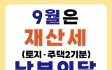해남 온라인뉴스팀2024. 09.11[뉴스앤저널]전라남도 나주시는 토지 및 주택 소유자를 대상으로 9월 정기분 재산세 8만1866건에 213억 원을 부과했다고 11일 밝혔다. 이번에 부과된 재산세는 토지분은 7만6240건에 196억원, 주택2기분은 5626건에 17억원으로 오는 9월 30일까지 납부하면 된다. 9월 정기분 재산세는 소유기간에 관계없이 과세기준일인 6월 1일 현재 토지 및 주택 소유자에게 부과된다. 다만 주택 재산세는 20만원 이하이면 7월에 전액 부과되지만, 20만원을 초과할 경우 7월과 9월에 각각 1/2씩 분할 부과된다. 재산세는 전국 모든...