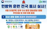 연예 온라인뉴스팀2024. 08.13[뉴스앤저널]영암군이 을지연습 기간인 이달 22일 오후 2시부터 영암경찰서, 영암소방서, 육군 제8539부대 3대대 등과 민방위훈련을 실시한다. 전국에서 동시에 실시되는 이날 훈련은 ‘훈련 공습경보발령’ 15분-‘경계경보 발령’ 20분-‘경보해제’ 순서로 진행된다. 훈련 공습경보가 발령되면 영암군민은 가까운 민방위 대피소로 신속하게 대피해야 하고, 대피소가 없는 경우 안전한 지하공간으로 피하면 된다. 전국 민방위 대피소는 아파트 지하, 지하철역, 지하상가 등에 1만7,000여 곳이 지정돼 있다. 가까운 대피소 위치는...