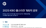 스포츠 온라인뉴스팀2024. 08.07[뉴스앤저널]KBO가 2025 KBO 올스타전 개최지를 공개모집한다. 지난 7월 인천에서 올스타전을 성황리에 마친 KBO는 내년도 올스타전 개최지 선정을 위해 공개모집을 실시한다. 올해 처음으로 진행되는 올스타전 개최지 공개모집은 올스타전 팬 서비스의 질을 향상시키고 범지역 축제를 통한 지역경제 활성화를 위해 진행하게 됐다. 공개모집 참가를 원하는 지자체는 필수 제출 서류를 작성하여 9월 23일(월)부터 9월 27일(금)까지 KBO 사무국으로 방문 또는 우편 제출해야 하며, 자세한 사항은 KBO 홈페이지 내 공고문을 통하여 확...