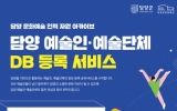 [뉴스앤저널](재)담양군문화재단은 25일부터 담양군문화재단 홈페이지에 담양에서 활동하는 예술인·예술단체를 대상으로 데이터베이스(DB) 등록 서비스를 제공한다고 밝혔다. 담양군문화재단에서 시행하는 DB 등록 서비스는 담양을 기반으로 활동하는 예술인과 예술단체를 대상으로 시행된다. 담양에서 활동하는 예술인·예술단체 중 조건에 부합한다면 신청서를 작성해 담당 부서에 제출하면 된다. 제출된 서류는 담양군문화재단 내부 검토를 거쳐 누리집에 게재된다. DB 등록이 완료된 예술인은 자신의 문화예술 활동을 공유해 이용자들에게 홍보할 ...