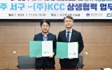 서구 온라인뉴스팀2024. 07.18[뉴스앤저널]광주광역시 서구가 ㈜KCC와 ‘민관협력 착착착(착한서구 착한기업 착한동행) 프로젝트’의 첫발을 내디뎠다. 서구는 지난 17일 서구청 나눔홀에서 ㈜KCC와 함께 지역사회에 선한 영향력을 전파하고 상생하기 위한 ‘착한 쿨루프’사업 업무협약을 체결했다. ‘착한 쿨루프’란 지붕을 차열페인트로 도색해 건물 내부 온도를 낮춰 여름철 무더위로부터 취약계층을 보호하고 에너지 효율을 높이는 친환경 사업이다. 이를 위해 서구는 에너지 취약계층 이용시설 발굴·추천 및 행정적 지원과 모니터링을 하고, KCC는 고기능성 차열페인트 도색...