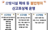 신안 온라인뉴스팀2024. 07.08[뉴스앤저널]목포소방서는 특정소방대상물 안전관리 강화 및 화재 시 인명피해 방지를 위해 소방시설 등 불법행위 근절 신고포상제를 상시 운영한다고 밝혔다. 소방시설 등 불법행위 신고포상제는 소방시설을 대상으로 불법 행위를 신고하는 경우 포상금을 지급해 시민들의 안전의식을 확산과 인명피해를 최소화하고자 추진되는 제도다. 신고 대상으로는 문화ㆍ집회시설이나 판매ㆍ숙박ㆍ위락시설, 다중이용업소 등에서 ▲비상구 등 폐쇄ㆍ훼손 행위 및 장애물을 설치하여 피난에 지장을 주는 행위 ▲소화펌프 등 소방시설 고장 방치 ▲소방시설 차단ㆍ임의 조작으로 작...