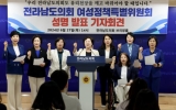 전라남도 온라인뉴스팀2024. 06.27[뉴스앤저널]전라남도의회 여성정책특별위원회는 도의회 브리핑룸에서 의장단 구성의 다양성 확대와 상임위원장의 여성 참여 증진을 요구하는 성명서를 발표했다. 전라남도의회 제382회 임시회 본회의를 통해 의장단과 상임위원장 선거가 치러진 6월 27일 오늘, 여성정책특별위원회 위원들이 합심하여 전라남도의회의 변화를 촉구했다. 이날 성명서를 발표한 박현숙 여성정책특별위원회 위원장(더불어민주당·비례)은 “제12대 전라남도의회는 의원 정수 61명 중 여성의원이 10명으로 역대 의회 중 여성의원 비율이 가장 높다”며 “정치를 남성의 영역으로 여...
