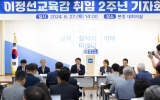 [뉴스앤저널]이정선 교육감이 27일 취임 2주년 기자회견에서 “지난 2년의 성과를 바탕으로 함께할 미래 광주교육의 변화와 발전을 위해 아낌없이 쓰겠다“고 밝혔다. 이 교육감은 지난 2년은 ”광주시민들께 했던 약속을 지키기 위해 밤낮없이 발로 뛰었다“며 ”더 많이 고민하고, 더 깊이 성찰하며 광주교육의 변화를 위해 땀 흘린 시간이었다“고 말했다. 이어 학생의 다양한 실력을 키우기 위한 주요 성과로 ▲일반고 49개교 대입디렉터 배치 ▲365일 24시간 진로진학 상담서비스 ▲학생 글로벌 리더 세계 한바퀴 등을 언급했다. 또 배...