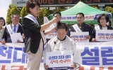 [뉴스앤저널]전라남도의회 김진남 의원(순천5, 더불어민주당)이 민주당 순천(갑)지역위원회와 함께 지난 5월 31일 오전 순천대학교 정문 앞 광장에서 순천대학교 의과대학 설립을 강력히 촉구하며 전남도의 단일 의대 공모 계획 철회를 요구하는 천막농성 출정식을 개최했다. 이날 출정식은 순천대 의대 설립 결의를 다지기 위해 김진남 의원의 삭발식을 진행하고, 순천 지역당원과 시민, 신민호·김정희 도의원, 나안수·강형구·이영란·김미연·정홍준·김태훈·신정란·장경순 순천시의원 등 50여 명이 참석한 가운데 순천대학교 의과대학 설립의 필요성과 전...