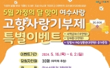 여수 온라인뉴스팀2024. 05.20[뉴스앤저널]여수시가 5월 가정의 달을 맞아 오는 6월 2일까지 ‘여수사랑 고향사랑기부제 특별 이벤트’를 진행한다. 이벤트는 10만 원 이상 고향사랑 기부자를 대상으로 30명을 추첨해 여수상품권 3만원을 추가로 제공하는 행사다. 참여방법은 10만 원 이상 기부하고 답례품 선택을 완료하면 자동으로 응모된다. 시는 당첨 결과를 6월 중으로 시청 누리집에 공개하고 대상자에 개별 연락할 계획이다. 차주민 징수과장은 “가정의 달, 국내 최고의 관광도시 여수를 방문하시면서 여수에 대한 관심과 사랑으로 고향사랑기부제에도 많은 동참을 바란...