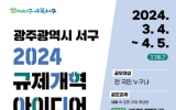서구 최준규 기자2024. 03.04[뉴스킹]광주광역시 서구가 주민 생활 및 기업·경제활동에 걸림돌이 되는 불합리한 규제를 발굴·개선하기 위해 ‘2024년 규제개혁 아이디어 공모전’을 개최한다. 서구는 오는 4월 5일까지 ▲기업 경영활동 제약 해소 ▲소상공인 생업 여건 개선 ▲친환경·신산업분야 규제 합리화 ▲일자리 창출 ▲출산, 육아, 노인, 장애인, 저소득층 등의 복지 저해 규제 ▲주민 일상 불편 개선 등 생활 및 경영과 관련된 규제 개선 아이디어를 접수받는다. 이번 공모전은 지역 제한 없이 국민 누구나 참여 가능하며, 서구청 감사담당관 법무규제혁신팀으로 우편...