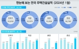 농·수·축협·산림조합 최준규 기자2024. 02.29[뉴스킹]국토교통부는 ’24년 1월 기준 주택 통계를 발표했다. (건설) '24.1월 주택 인허가, 착공, 분양, 준공은 전년 동기 대비 증가한 것으로 나타났다. 1월 인허가는 25,810호로 전년 동기(21,425호) 대비 20.5% 증가했다. 1월 착공은 22,975호로 전년 동기(15,612호) 대비 47.2% 증가했다. 1월 분양(승인)은 13,830호로 전년 동기(1,852호) 대비 646.8% 증가했다. 1월 준공은 36,762호로 전년 동기(16,141호) 대비 127.8% 증가했다. (거래량) 1...