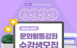 대통령실 최준규 기자2024. 02.26[뉴스킹] 원주교육문화관(관장 유선종)은 2월 27일부터 3월 8일까지, 2024년 상반기 문화활동강좌 수강생을 모집한다. 상반기 문화활동강좌는 3월부터 7월까지 초등학생, 중학생, 학부모를 대상으로 총 39개 강좌가 운영되며, 개별 재료 준비가 필요한 강좌를 제외한 모든 강좌를 무료로 수강할 수 있다. 특히 이번 상반기에는 △유아발레 △생각을 그리는 비주얼씽킹 △숏폼 크리에이터 △태블릿 디지털 드로잉 △글씨교정 필사의 행복 등이 신규 개설되며, 대면수업 참여가 어려운 수강생들을 위한 비대면 온라인 강좌도 2개 새롭게 추가됐...