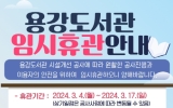 광양 최준규 기자2024. 02.21[뉴스킹]광양용강도서관은 독서·문화 환경 개선을 위한 시설 공사로 3월 4일부터 3월 17일까지 2주간 임시휴관 한다. 쾌적한 독서 환경조성과 이용자 편의 도모를 위해 1층 어린이자료실 확장, 통합안내 데스크 설치, 냉난방기 증설 등 시설 개선(리모델링) 공사를 시작한다. 임시휴관에 따라 불가피하게 도서 반납을 제외한 대출, 열람, 상호대차, 가족실 이용, 매주 토요일 마로극장 영화상영 등을 비롯한 모든 서비스와 함께 도서관 이용이 제한된다. 용강도서관에서는 이용자 편의를 위해 휴관 전(前) 2월 26일부터 3월 3일 까지 1...