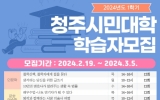 정치일반 최준규 기자2024. 02.21[뉴스킹]청주시는 ‘2024년 1학기 청주시민대학’ 학습자 300명을 모집하고 있다고 밝혔다. 청주시민대학은 민선 8기 공약사업으로, 대학교 강사 및 연구소 연구원 등을 강사로 초빙해 시민들에게 대학 수준의 깊이 있는 평생교육 과정을 제공하는 프로그램이다. 100시간 이상 참여해 교육을 수료하면 청주시장 명의의 명예학사 학위를 받을 수도 있다. 청주시민 누구나 신청 가능하며, 오는 3월 5일까지 청주시민대학 홈페이지에서 온라인으로 신청하면 된다. 강좌는 오는 3월 18일부터 6월 19일까지 12주간 청주시평생학습관에서 진행된...