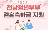 전라남도 최준규 기자2024. 02.18[뉴스킹]전라남도는 청년의 결혼 초기 경제적 부담을 덜어주고 지역 정착을 유도하기 위해 총 100억 원 규모의 청년부부 결혼축하금을 지원한다고 밝혔다. 청년부부 결혼축하금 지원은 전남도가 2021년 전국 광역시·도 중 최초로 시행한 사업으로, 49세 이하 부부가 대상이다. 혼인신고 후 6개월이 경과한 날부터 신청할 수 있다. 신청일 직전까지 부부 모두 전남에 6개월 이상 계속 주소를 두고 거주해야 한다. 다만 부부 중 누구라도 이전에 청년부부 결혼축하금을 수령한 경우 지원 대상에서 제외된다. 전남도는 올해부터 신청 기간을 혼인신...