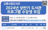 의회 최준규 기자2024. 02.16[뉴스킹]강릉시립도서관은 시민들의 삶의 질 향상과 독서문화 형성을 위해 '2024년 상반기 도서관 프로그램' 총 13개 프로그램에 참여할 수강생을 2월 16일부터 2월 23일까지 모집한다. 모루도서관에서는 인문·독서 분야 5개 프로그램(▲스토리텔링 낭독법 ▲수필 ▲그림책 심리치유 ▲영어부모교육 ▲팝송영어), 문화·예술 분야 2개 프로그램(▲연필소묘 ▲스트레스 관리법), 영·유아 분야 2개 프로그램(▲10~18개월 책놀이 ▲19 부터 40개월 책놀이)을 운영한다. 성덕반딧불작은도서관에서는 4개 프로그램(▲어반스케치 ▲한국사...