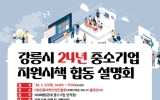 의회 최준규 기자2024. 02.16[뉴스킹]강릉시는 기업인들에게 다양한 지원시책 정보 제공을 통해 경영활동을 지원하고 나아가 기업하기 좋은 여건을 조성하기 위해 ‘2024년 강릉시 중소기업 지원시책 합동 설명회’를 개최한다. 기업지원을 담당하는 12개 기관과 함께하는 이번 합동 설명회는 오는 22일 오후 2시 (재)강릉과학산업진흥원 율곡관에서 △행정, △지원・연구, △자금, △판로・수출・교육 등 4가지 분야로 나눠서 진행된다. 참여 기관은 강릉시를 비롯해 강원지방중소벤처기업청 강원영동사무소, 강릉과학산업진흥원, KIST강릉분원 천연물연구소, 한국생산기술연구원...