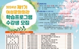 최준규 기자2024. 02.13[뉴스킹]여수시 여성문화회관에서 3월부터 5월까지 진행하는 ‘제1기 여성문화회관 학습프로그램’ 수강생을 모집한다. 모집 과목은 ▲양재, 제과제빵, 홈패션 등 기능반 10개 과목 ▲민화, 소도구필라테스, 한국무용 등 취미반 17개 과목 ▲의류수선, 손님초대요리, 플루트 등 야간반 11개 등 총 38개 프로그램이다. 이 중 밸리댄스, 소도구필라테스, 여성합창 3개 과목은 여성 전용 수강 과목이다. 모집인원은 총 524명으로 오는 28일까지 16일간 수강인원 전원 선착순 접수된다. 여수시에 거주하는 시민은 누구나 1인당 2과...