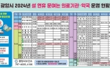 화순 최준규 기자2024. 02.05[뉴스킹]광양시는 설 연휴 시민과 귀성객의 의료기관, 약국 이용 불편을 최소화하기 위해 오는 9일부터 12일까지 4일간 소아·임산부와 응급환자에 대한 비상진료대책을 마련했다. 설 연휴 비상진료대책을 차질 없이 운영하기 위해 광양시보건소 내 ‘비상진료 대책 상황실’을 설치하고 의료기관 상황 모니터링 등 긴급 상황 발생 시 신속 대응할 방침이다. 연휴 기간 지역응급의료기관 광양사랑병원, 광양서울병원 2개소에서 응급실 24시간 비상 체제로 운영하며 당직 병의원 14개소, 보건의료기관 5개소, 휴일지킴이 약국 22개소를 지정·운영한다....