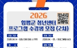 [뉴스앤저널]전남 함평군이 상반기 청년센터 프로그램 참여자를 모집한다. 함평군은 14일 “2026년 상반기 청년센터 프로그램 참여자를 2차 모집한다”고 밝혔다. 지원 대상은 공고일 기준 함평군에 주민등록을 두고 거주하고 있는 19세 이상 49세 이하 청년이다. 프로그램별로 최대 16명을 선착순 모집한다. 모집 대상 프로그램은 ▲공인중개사 자격증반 ▲온라인 마케팅 창업 교육 ▲영상 편집 교육 ▲성인 영어 회화반 등 총 4개다. 참여 희망자는 구비서류를 갖춰 네이버 폼 또는 전자우편으로 신청하면 된다. 군은 신청자에 ...