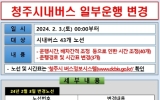 의회 최준규 기자2024. 02.01[뉴스킹]청주시는 오는 2월 3일부터 시내버스 43개 노선의 운행 시간 및 경로를 일부 조정한다고 밝혔다. 지난해 12월 9일 노선 전면 개편 시행 후, 지속적인 모니터링을 통해 접수한 시민 불편 사항 중 타당한 의견을 반영한 것이다. 기존 산성-명암약수터-체육관을 운행하던 862번 버스는 12월 9일 노선 개편과 함께, 명암약수터를 미운영하는 것으로 변경된 바 있다. 이에 명암약수터~산성 구간을 등산하는 시민으로부터 불편하다는 민원이 지속적으로 제기됐고, 시는 시민 의견을 반영해 862번 버스 노선을 청주박물관을 경유(산성→...