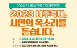 종합 최준규 기자2024. 01.31[뉴스킹]나주시의회는 2월 6일 14시, 송월동 행정복지센터 회의실(2층)에서 ‘2024년 나주시의회 다 함께 토론회’를 개최한다. 이번 토론회는 ‘2023 나주축제, 시민의 목소리를 듣다’라는 주제로 지난해 개최된 2023 나주 통합축제에 관한 생각을 자유롭게 말하고 의견을 나누기 위해 마련된 자리이다. 다 함께 토론회는 형식에 구애 받지 않고 시민이 직접 토론자가 되어 의견을 논의하는 방식으로 진행될 예정이며, 나주시민이면 누구나 참석하여 축제 장소·기간·콘텐츠 등 나주축제와 관련된 내용을 이야기할 수 있다. 나주시의회는 ...