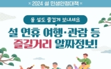 광주메인 최준규 기자2024. 01.30[뉴스킹]올 설도 즐겁게 보내세요. 설 연휴 여행·관람 등 즐길거리 알짜정보! 숙박 쿠폰 20만 장 국내여행 부담 덜어드려요! 비수도권 숙박 쿠폰 20만 장 배포 5만 원 이상 숙박시설 예약시 3만 원 할인 Ⅴ 1차 : 9만 장(배포·사용: 2.7.~25.) Ⅴ 2차 : 11만 장(배포 : 2.27.~3.31. / 사용 : ~4.14.) 15만 명 휴가비 지원 국내여행 부담 덜어드려요! 근로자 휴가 지원 15만 명 모집(2.1.~) 정부·기업이 20만 원 여행경비 지원 Ⅴ 중견·중소기업, 소상공인 : 정부(10만 원)+기업(...