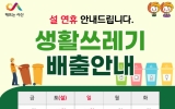 의회 최준규 기자2024. 01.29[뉴스킹]충남 서산시가 설 명절 기간 중 서산시민의 쾌적한 주거환경을 위해‘설 명절 쓰레기 관리대책’을 29일부터 2월 18일까지 시행한다. 이번 관리 대책은 설 명절 기간에 생활 쓰레기 수거 일정을 홍보해 올바른 일자에 배출하도록 유도하고 생활 쓰레기 민원 사항을 신속히 접수해 처리하기 위해 시행된다. 시에 따르면 2월 10일 설날 당일과 2월 11일을 제외하고 모든 생활 쓰레기는 정상적으로 수거된다. 또한 설 명절 기간(2.9.~12.)에 자원순환과 직원 12명을 총 4개 반으로 편성해 환경종합상황실을 운영하고 수거업체 직...