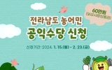 최준규 기자2024. 01.23[뉴스킹] 보성군은 오는 2월 23일까지 관내 농어업·임업 종사자를 대상으로 ‘2024년 농어민 공익수당’ 신청을 받는다고 밝혔다. 신청은 오는 2월 23일까지 경영체 등록부 등 필요 서류를 구비해 주소지 읍면 행정복지센터(면사무소)에서 방문 신청 가능하다. 보성군은 신청자의 자격 여부 확인을 거쳐 4월부터 60만 원 상당의 ‘정책 발행용 보성사랑상품권’을 지급할 예정이다. ‘정책 발행용 보성사랑상품권’은 연매출액 30억 초과한 사업장(농협하나로마트 등)에서도 사용할 수 있다. 농어민 공익수당은 1가구당 연 ...