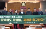 대통령실 최준규 기자2024. 01.22[뉴스킹]담양군의회는 22일, 군의회 본회의장에서 『달빛철도 특별법』의 신속한 제정을 촉구하는 성명서를 발표했다. 군의회는 성명서를 통해 “지역민들이 염원하던 철도 숙원사업인 광주-대구 달빛철도 건설을 위한 특별법이 국회에서 처리되지 못한 데 대해 깊은 유감과 심각한 우려를 표한다”면서 “『달빛철도특별법』은 국토 균형 발전과 동서 화합을 넘어선 국민통합, 지방소멸 위기 극복의 견인차 역할을 하게 될 법안으로 신속한 제정을 촉구한다.”고 강조했다. 담양군의회 최용만 의장은 “국회는 국민통합을 위해 제21대 국회에서 반드시 특별법 ...