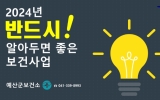 최준규 기자2024. 01.19[뉴스킹]예산군보건소는 2024년 새해를 맞아 보건사업 홍보영상을 제작했다고 밝혔다. 이번 홍보영상은 주민이 꼭 알아두면 좋은 보건사업을 알리기 위한 목적으로 제작됐으며, 보건소에서 각 팀별로 추진하고 있는 주요 사업 내용이 담겼다. 특히 2024년 보건소 신규사업으로는 의료서비스 접근성이 부족한 12개 읍면 395개 경로당에 안전 구급함을 설치하고 응급처치 물품을 지원하는 사업이 있다. 또한 삽교읍 내포 보건지소에 임산부를 위한 편의 증진 및 지역 인구 증가에 적극 대응하고자 선제적으로 인력충원 및 예비 부모 임신 준비 지원...