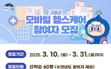 고흥 온라인뉴스팀2025. 03.07[뉴스앤저널]고흥군은 군민의 자가 건강관리 능력 향상을 위해 ‘2025년 모바일 헬스케어 사업’ 참여자 60명을 오는 10일부터 선착순으로 모집한다고 밝혔다. 신청 자격은 19세 이상 64세 이하의 고흥군민으로 고혈압, 당뇨, 고지혈증 약을 복용하지 않으며, 혈압, 공복혈당, 중성지방, HDL콜레스테롤, 허리둘레 중 1가지 이상의 건강 위험 요인을 보유하고 있으면 참여할 수 있다. 사업 참여자는 보건소 전문가(간호사, 영양사, 운동처방사)로부터 6개월 동안 정기 건강검진과 개인 맞춤형 건강상담을 받을 수 있으며, 건강 관리를 지...