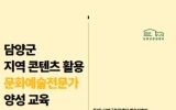 나주 온라인뉴스팀2025. 01.17[뉴스앤저널](재)담양군문화재단은 다음달 7일까지 문화예술 전문가 양성 기초과정 참여자를 모집한다고 밝혔다. 재단 문화예술 전문가 양성 과정은 담양군 지역 문화를 기반으로 문화예술전문가를 육성하기 위한 교육으로, 2월 20일부터 4월 3일까지 총 7회차 과정을 매주 목요일(1·2회차 목·금요일) 오후 5시에 진행한다. 이번 교육은 지역 문화를 활용한 콘텐츠 기획을 주제로 다방면의 문화·예술 전문가로부터 문학, 축제, 공연, 뮤지컬과 같은 콘텐츠뿐만 아니라 경영, 마케팅 등에 대한 실무적·학문적 강의를 들을 수 있는 자리로 마련됐...