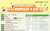 여수 최준규 기자2024. 01.11[뉴스킹]여수시 평생학습관에서 오는 15일부터 19일까지 5일간 제1기 프로그램 수강생을 선착순 모집한다. 평생학습관 상설 프로그램은 이순신도서관 1층에서 3개월 과정으로 12월까지 3기로 나눠 운영되며, 학습자는 매 기수별로 모집된다. 제1기 프로그램은 △문화예술 △인문교양 등 총 43개 과목으로 주중 과정 외 직장인들을 위한 야간·주말 과정으로 구성, 학습자의 평생학습 기회 확대를 위해 마련됐다. 오는 29일부터 4월 20일까지 과목별 25명의 정원으로 운영되며, 교육비는 무료이나 과목별 재료비는 학습자가 부담해야 ...