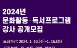 정치일반 최준규 기자2024. 01.10[뉴스킹]강원도교육청 동해교육도서관은 1월 10일부터 1월 16일까지, 2024년 문화활동·독서프로그램 강사를 공개 모집한다. 지도강사 공개모집 프로그램은 △문화활동 14개 △독서진흥 6개 프로그램으로 강사지원서, 자기소개서, 강의계획서 등의 서류 심사를 거쳐 선정할 예정이다. 강사 지원 자격으로는 △해당 분야 전공 과정의 학위 또는 자격증 소지자 △전문가 또는 경력자로 전문지식이 있다고 인정할 만한 자격요건을 갖추어야 한다. 지원 방법은 동해교육도서관 홈페이지에 양식을 내려받아 1월 16일까지 2층 사무실로 방문,...