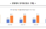 문화 최준규 기자2024. 01.10[뉴스킹]문화체육관광부는 전국 17개 시도 만 10세 이상 국민 9천 명을 대상으로 시행한(조사기관: 한국스포츠정책과학원) ‘2023년 국민생활체육조사’ 결과를 발표했다. 2023년 생활체육 참여율(주 1회, 30분 이상 규칙적 체육활동)은 62.4%로 전년도 61.2% 대비 1.2%포인트(p) 증가했다. 코로나19 이전인 2019년 66.6%에는 아직 미치지 못하나, 코로나19 발생기간(’20~’22년)의 평균 참여율 60.7%보다는 증가한 것으로 나타났다. 읍면지역 이하, 60대, 저소득층의 생활체육 참여율 상승, 10대...