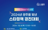 광산구 온라인뉴스팀2024. 12.02[뉴스앤저널]올해 광주시의 ‘베스트10 정책’은 뭘까? 광주시민들이 광주를 빛낸 우수정책들을 직접 뽑는다. 광주광역시는 오는 5일 시청 대회의실에서 ‘2024년 광주를 빛낸 스타정책 경진대회’를 개최한다. 올해 두 번째로 여는 ‘스타정책 경진대회’는 기존 우수정책 평가의 단점을 보완해 일회성 평가가 아닌 지난 4월부터 11월까지 8개월동안 연중 지속해 진행됐으며, 평가방법도 혁신적으로 전환해 전문가와 공무원 중심에서 시민 중심의 평가가 이뤄지도록 했다. 이 행사는 시민 중심의 연중 지속 평가인 ‘정책평가박람회’의 하나로,...