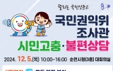 순천 온라인뉴스팀2024. 11.29[뉴스앤저널]순천시는 오는 12월 5일 10시부터 16시까지 시청 대회의실에서 국민권익위원회 ‘달리는 국민신문고’를 운영한다고 전했다. ‘달리는 국민신문고’는 국민권익위원회가 주관하는 프로그램으로, 시민들이 공공 서비스와 관련된 다양한 불편 사항을 직접 상담하고 해결할 수 있는 자리이다. 이번 행사에서는 권익위 조사관과 전문가 20여 명이 참여해 행정, 교육, 보훈, 세무, 복지, 노동, 건축 등 공공 서비스뿐만 아니라 소비자 피해, 지적 분쟁, 신용 회복, 민․형사 생활법률 등 생활 속 다양한 문제를 상담하고 해결 방안을 제...