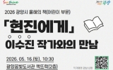 광양 이유빈 기자2026. 04.22[뉴스앤저널] 광양시는 오는 5월 16일 오전 10시 30분 꿈빛도서관에서 ‘2026년 올해의 책’ 어린이 부문 선정 도서'현진에게'의 저자 이수진 작가를 초청해 강연을 연다고 밝혔다. 이번 강연은 시립도서관이 추진하는 ‘시민 한 책 읽기’ 사업의 하나로, 지역 어린이들이 작가와 직접 만나 작품의 주제와 의미를 이해할 수 있도록 마련됐다. 이수진 작가는 화가 이중섭의 삶을 바탕으로 서로에게 손을 내미는 용기를 담은 동화 '현진에게'를 중심으로 ‘차별과 혐오를 넘어서는 다정한 공존’을 주제로 강연을 진행한다. 또한 어린이들이 ...