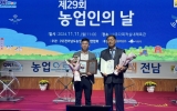 고흥 온라인뉴스팀2024. 11.12[뉴스앤저널]고흥군은 지난 11일 나주시에서 열린‘제29회 농업인의 날 기념행사’에서‘농업인 대상’ 및 ‘농식품부 장관 표창’을 각각 수상했다고 밝혔다. ‘농업인 대상’ 수상자(유통가공 부문)는 엔자임팜 김주호 대표(44세, 과역면)로, 김 대표는 지역농산물을 활용한 다양한 가공 제품을 개발하고, 수출을 통해 농산물의 가치를 높이는 데 크게 기여한 공로를 인정받아 전라남도지사 표창을 받았다. 특히, 고흥유자와 고흥쌀 등을 활용한 ‘아빠랑’ 제품을 개발하여 특허를 등록하고, 현재 6개국에 농산물을 수출하고 있다. 김 대표는 “지역농...